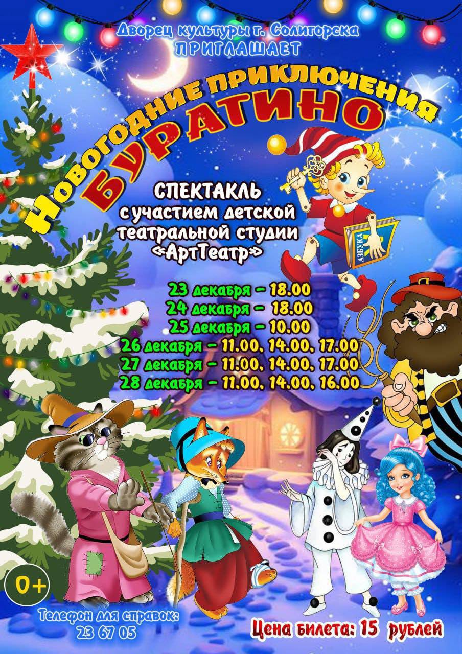 Дворец культуры г. Солигорска приглашает на на театрализованное представление с участием детской театральной студии «АртТеатр» «Новогодние приключения БУРАТИНО».Отправляйтесь в путешествие вместе с Буратино, помогите новогодним героям спасти праздник или откройте тайну, кто на самом деле дарит подарки.