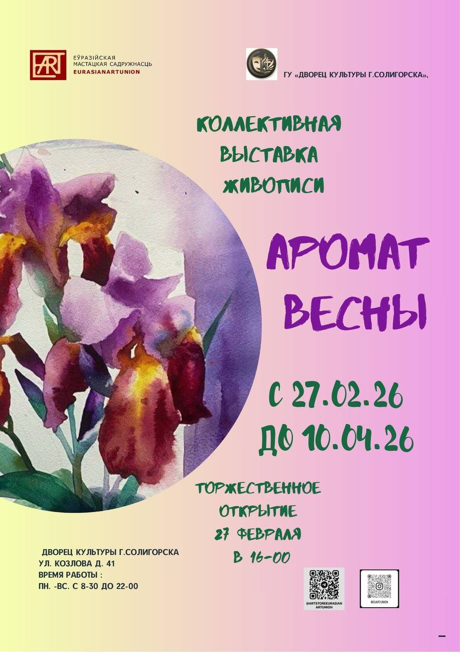 Хотите первыми вдохнуть аромат весны? Ждём вас во Дворце культуры г. Солигорска! 27 февраля состоится торжественное открытие коллективной выставки живописи «Ароматы весны». Художники подарят нам тепло, первые цветы и солнечное настроение, написанные кистью и красками.