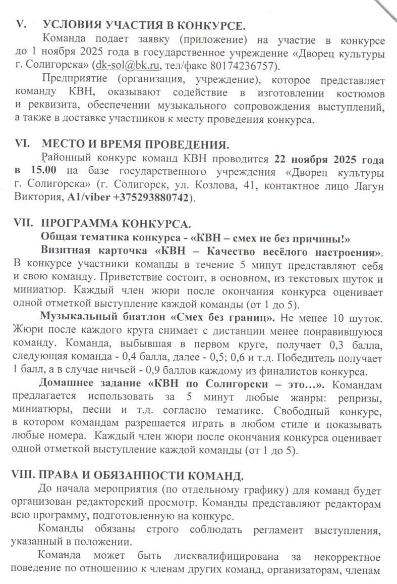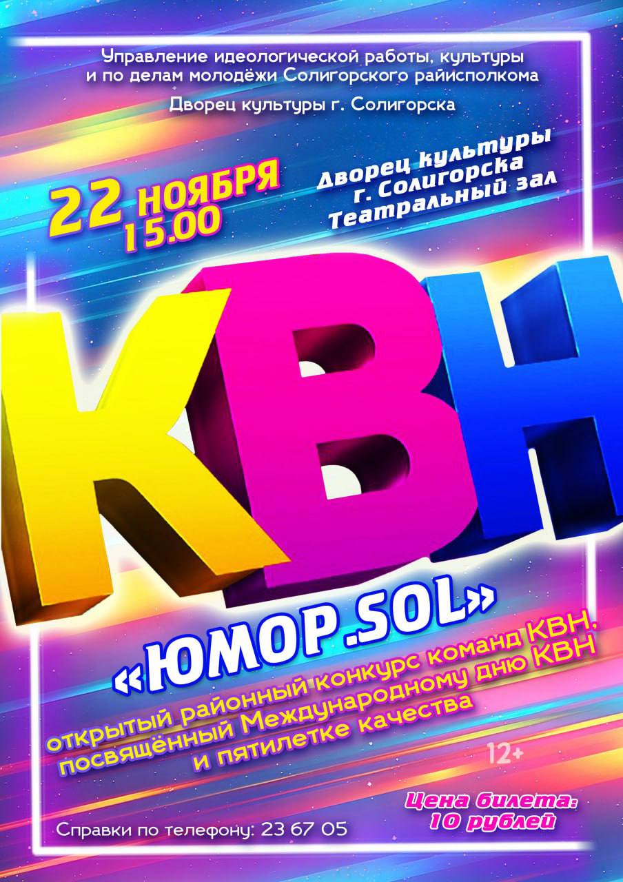 22 ноября 2025 года ГУ «Дворец культуры г. Солигорска» приглашает всех любителей юмора и поклонников легендарной игры КВН на открытый районный конкурс команд КВН под названием «Юмор.SOL», посвящённый Международному дню КВН.