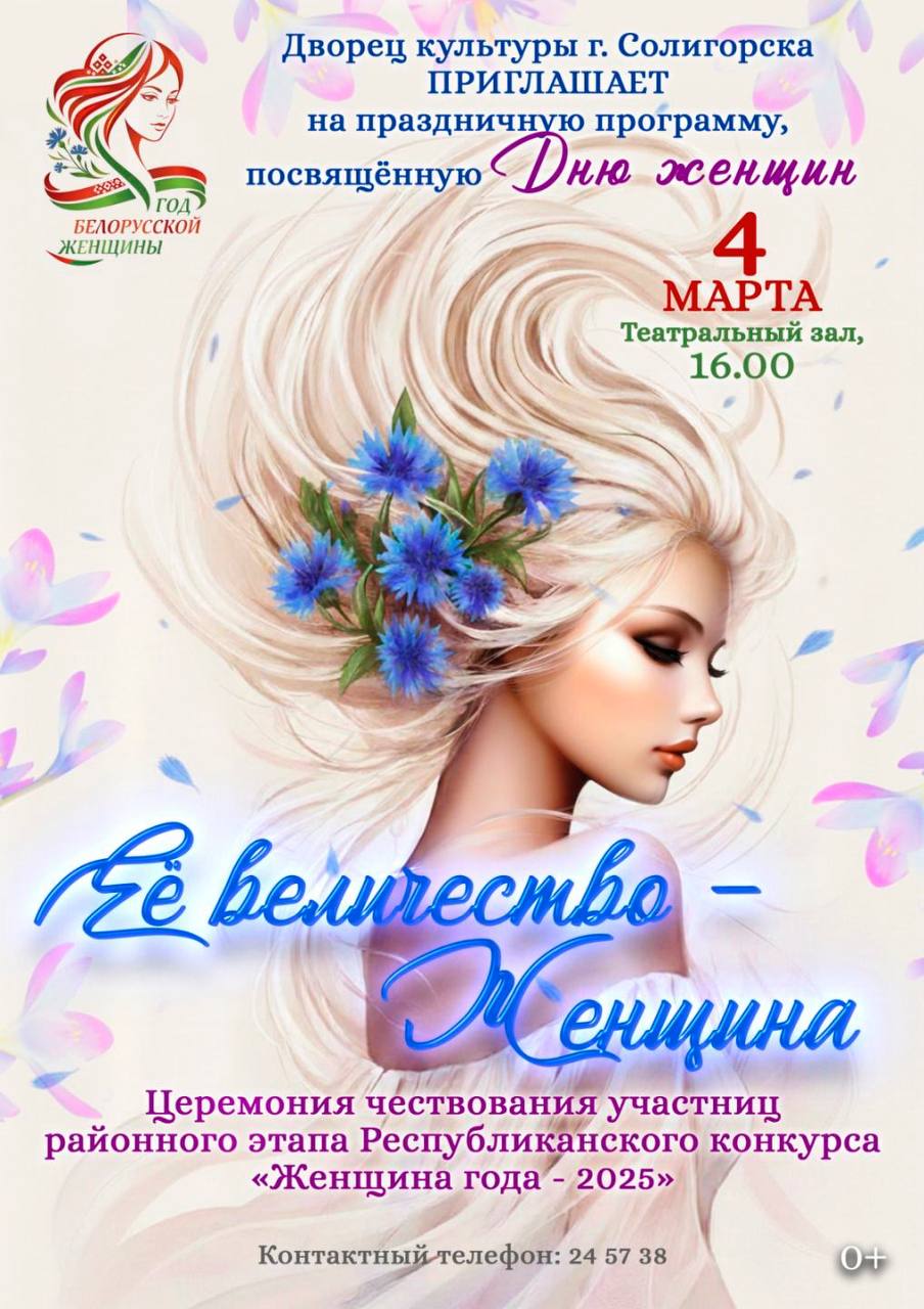 Дворец культуры г. Солигорска приглашает жителей и гостей города на праздничную программу «Её величество — Женщина», посвященную Дню женщин.