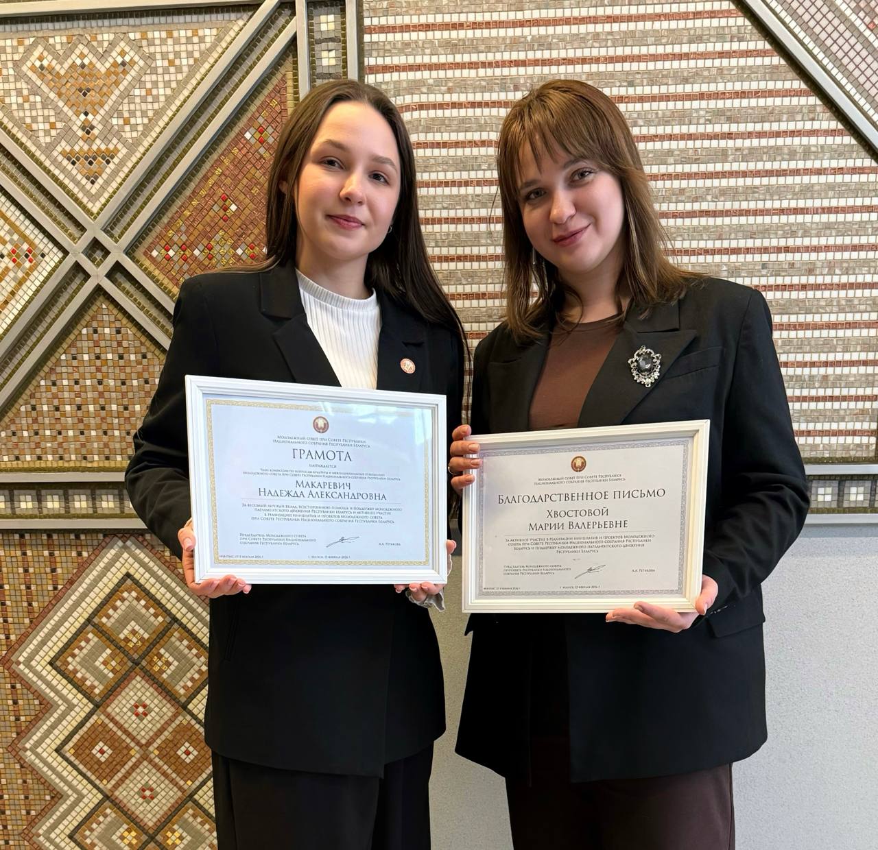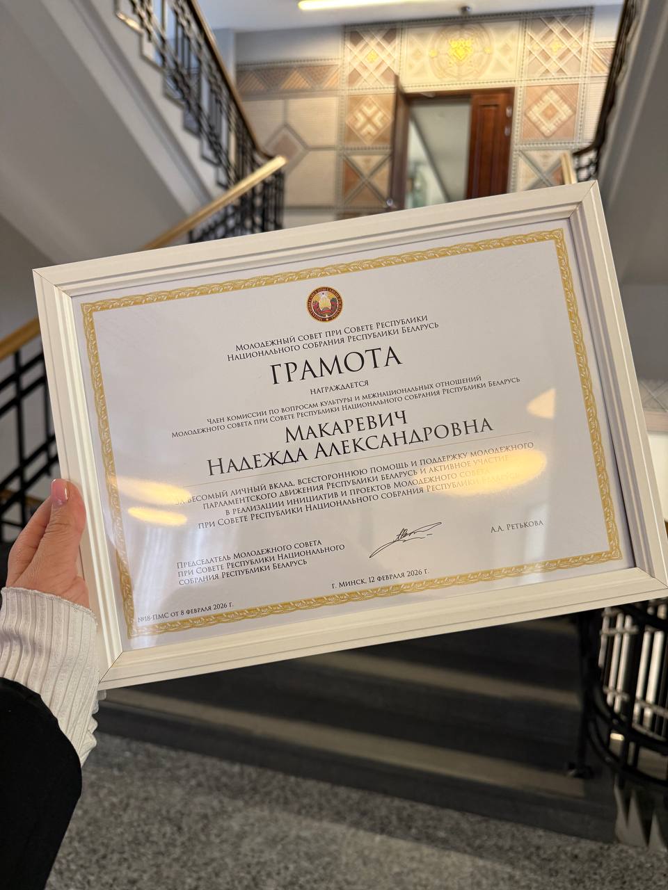 🌟Грамотой от Председателя Молодежного совета за весомый личный вклад отмечена Надежда Макаревич — член Молодежного совета и методист Дворца культуры г. Солигорска.
