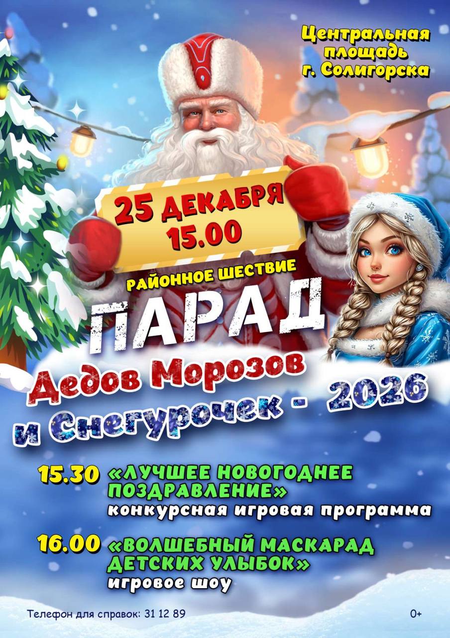 25 декабря в Солигорске будет дан старт праздничному циклу новогодних мероприятий. Местом главных событий станет Центральная площадь. Здесь состоится рождественская региональная ярмарка, а также пройдет традиционное шествие Дедов Морозов и сказочных персонажей. Начало мероприятия в 15.00.