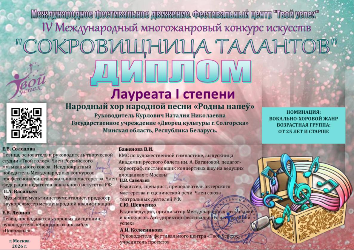 Народный хор народной песни «Родны напеў» — лауреат I степени IV Международного конкурса искусств «Сокровищница талантов» (г. Москва)! 🏆🎤