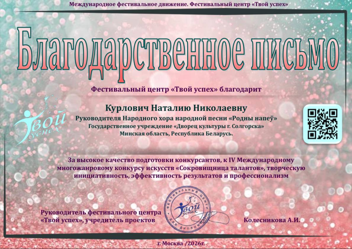 ✨ Поздравляем руководителя Наталию Николаевну Курлович с заслуженной благодарностью за высокий профессионализм!