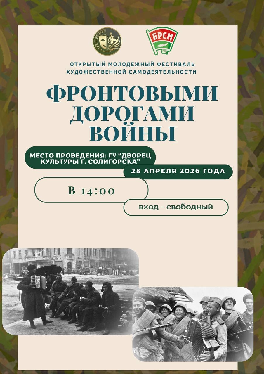 Дорогие друзья! Приглашаем вас на одно из самых трогательных событий этой весны — открытый молодежный фестиваль художественной самодеятельности «ФРОНТОВЫМИ ДОРОГАМИ ВОЙНЫ».
