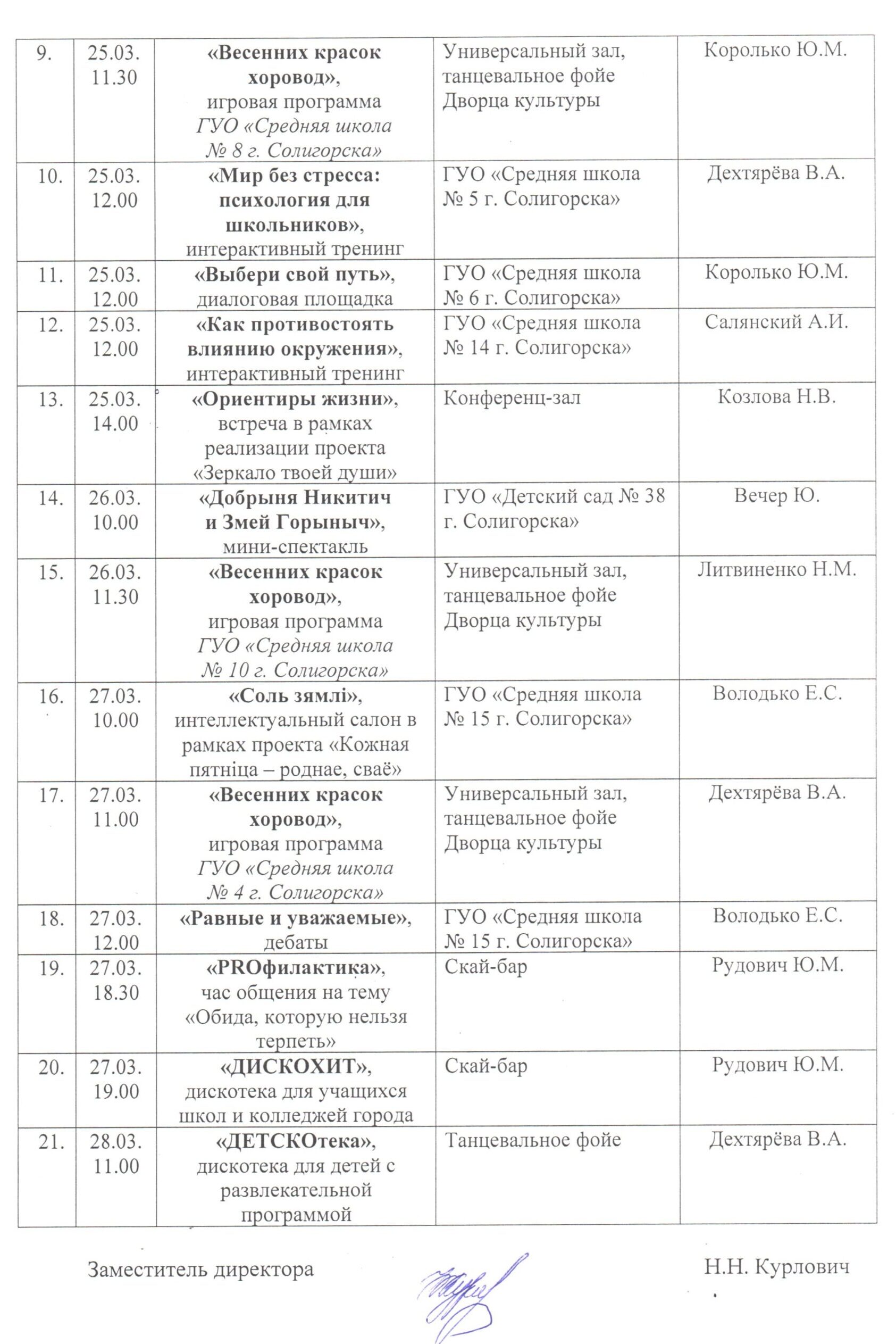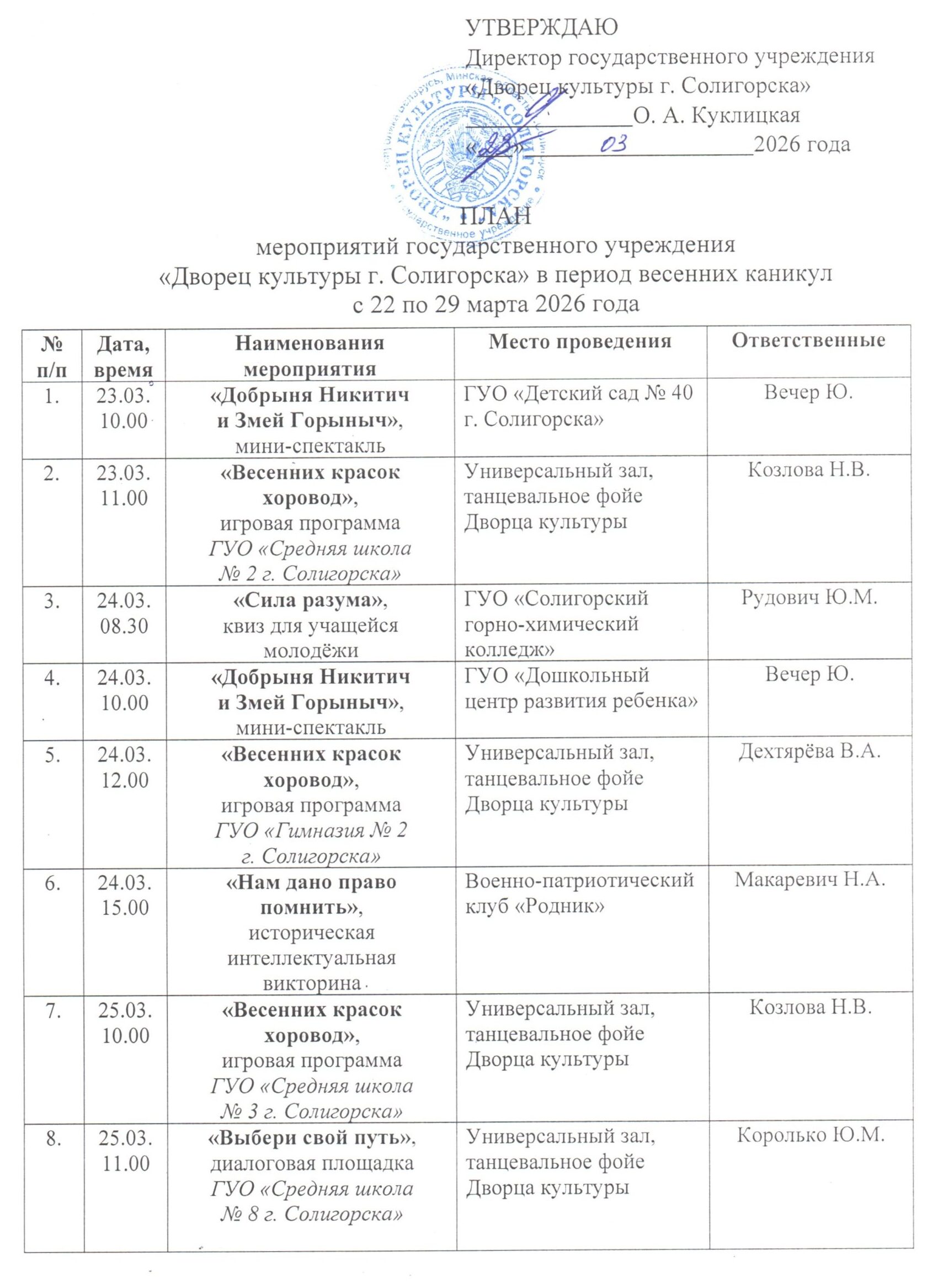 План мероприятий в период весенних каникул с 22 по 29 марта 2026 года