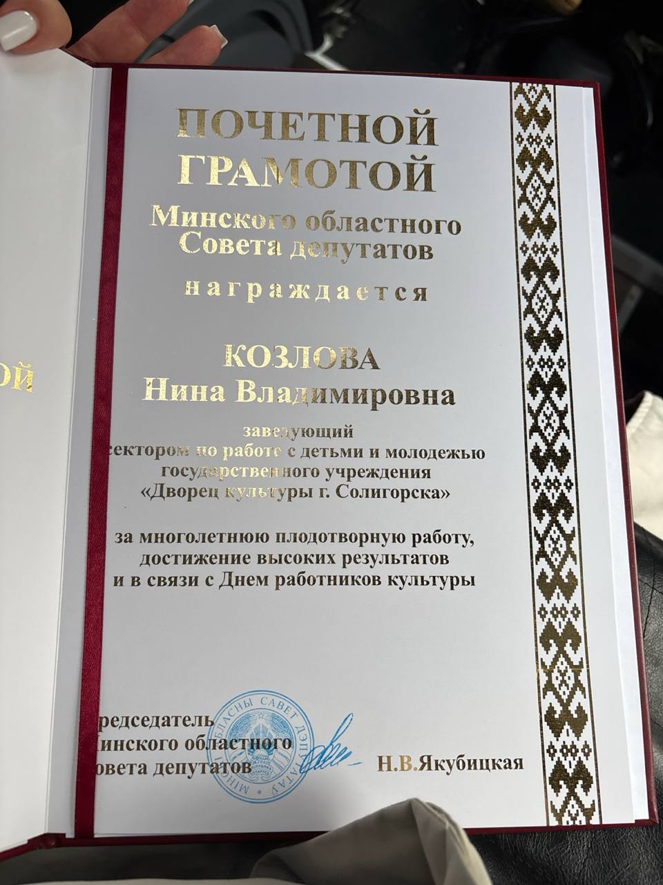 -Нина Козлова, заведующий сектором по работе с детьми и молодёжью Дворца культуры г. Солигорска, была награждена Почетной грамотой Минского областного Совета депутатов.
