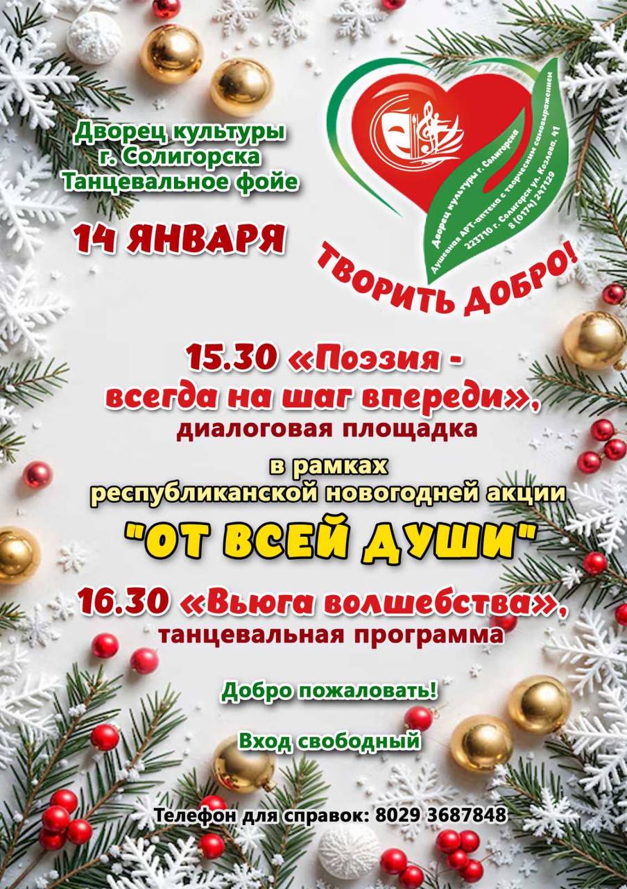 14 января в танцевальном фойе Дворца культуры пройдут праздничные мероприятия, приуроченные к республиканской новогодней акции «От всей души».