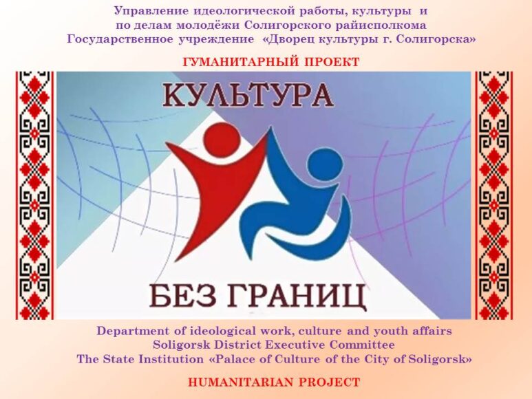 Project Summary | The humanitarian project «Culture without Borders» of the State Institution «Palace of Culture of Soligorsk» is aimed at meeting the social activity and needs of people with disabilities, which leads to conditions for ensuring the quality of their lives. All this is realized through the use of opportunities to attend cultural events, become familiar with cultural and artistic |