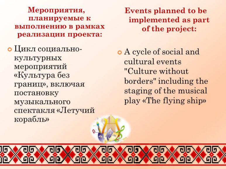 Цикл социально-культурных мероприятий «Культура без границ», включая постановку мюзикла «Летучий корабль» с участием молодых людей с инвалидностью и волонтерами ГУ «Дворец культуры г. Солигорска»; укрепление материально-технической базы: оборудование пандуса для подъёма инвалидов-колясочников на сцену; приобретение видеооборудования для организации онлайн-трансляции в сети Интернет мероприятий района для людей с инвалидностью, которые не могут по медицинским показаниям передвигаться и посещать ГУ «Дворец культуры г. Солигорска»; приобретение профессиональных радиосистем с поясным передатчиком и головным микрофоном; приобретение радиостанции для работников сцены (волонтеров); приобретение сценических костюмов, декораций. |