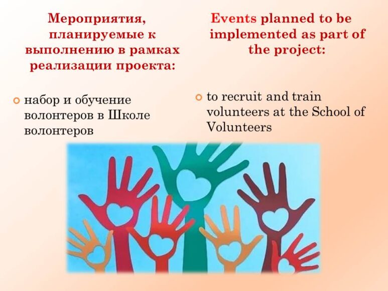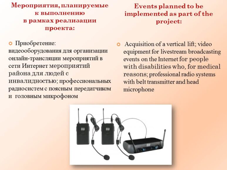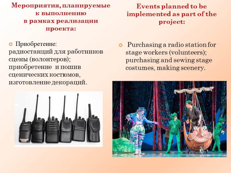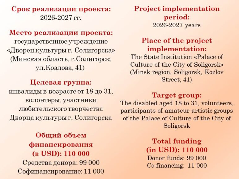Description of project activities | A series of socio-cultural events «Culture without Borders», including the production of the musical «The Flying Ship» with the participation of young people with disabilities and volunteers of the State Institution «Palace of Culture of Soligorsk»; strengthening the material and technical base: equipping a ramp for lifting wheelchair users onto the stage; purchase of video equipment for organizing online broadcasts of district events on the Internet for people with disabilities who, for medical reasons, cannot move and visit the State Institution «Palace of Culture of Soligorsk»; purchase of professional radio systems with a bodypack transmitter and a head-mounted microphone; purchasing a radio station for stage workers (volunteers); purchasing stage costumes and scenery. |