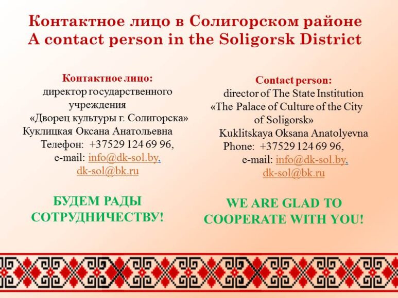 10. Contact person: Kuklitskaya Oksana Anatolyevna, director of The State Institution «Palace of culture of Soligorsk» (contacts: 80291246996, 80174-237610, dk-sol@bk.ru) |