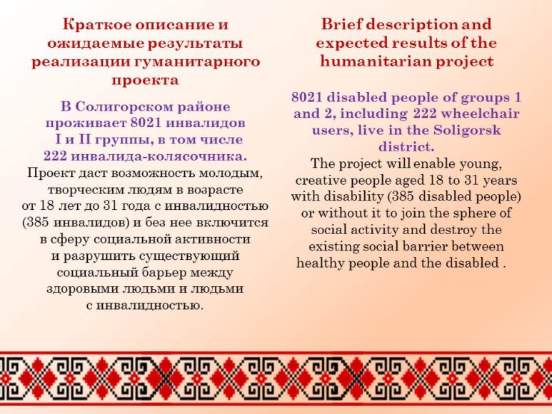 6. Target group: disabled people aged from 18 to 31, volunteers, participants of amateur creativity of Palace of culture of Soligorsk. The project will enable young, creative people aged 18 to 31 years with disability (385 disabled people) or without it to join the sphere of social activity and destroy the existing social barrier between healthy people and the disabled . | |