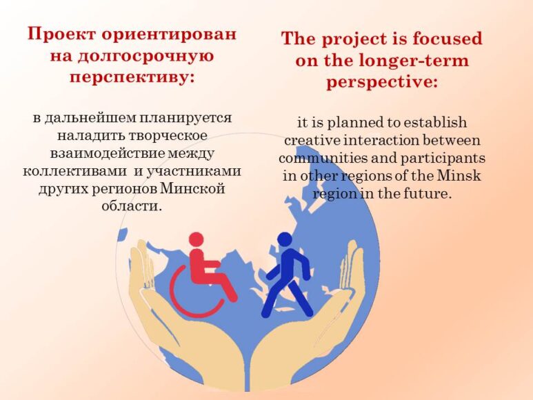 The envisaged objectives during the project work | involvement of the media in the coverage of events; drawing attention of the society to the problems of people with disabilities; erasing physical and psychological barriers and creating a unified creative communication space for people with and without disabilities; inclusion of creative people under the age of 31 with and without disabilities in social activities; development of inclusion in the creative space of Soligorsk district; creative interaction between teams and participants of other districts of Minsk region |